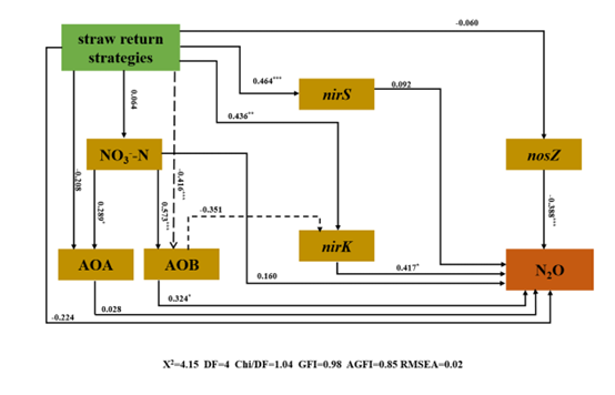 结构方程模型(SEM)表明秸秆还田通过影响AOB-amoA基因、nirK基因和nosZ基因进而间接影响N2O释放。