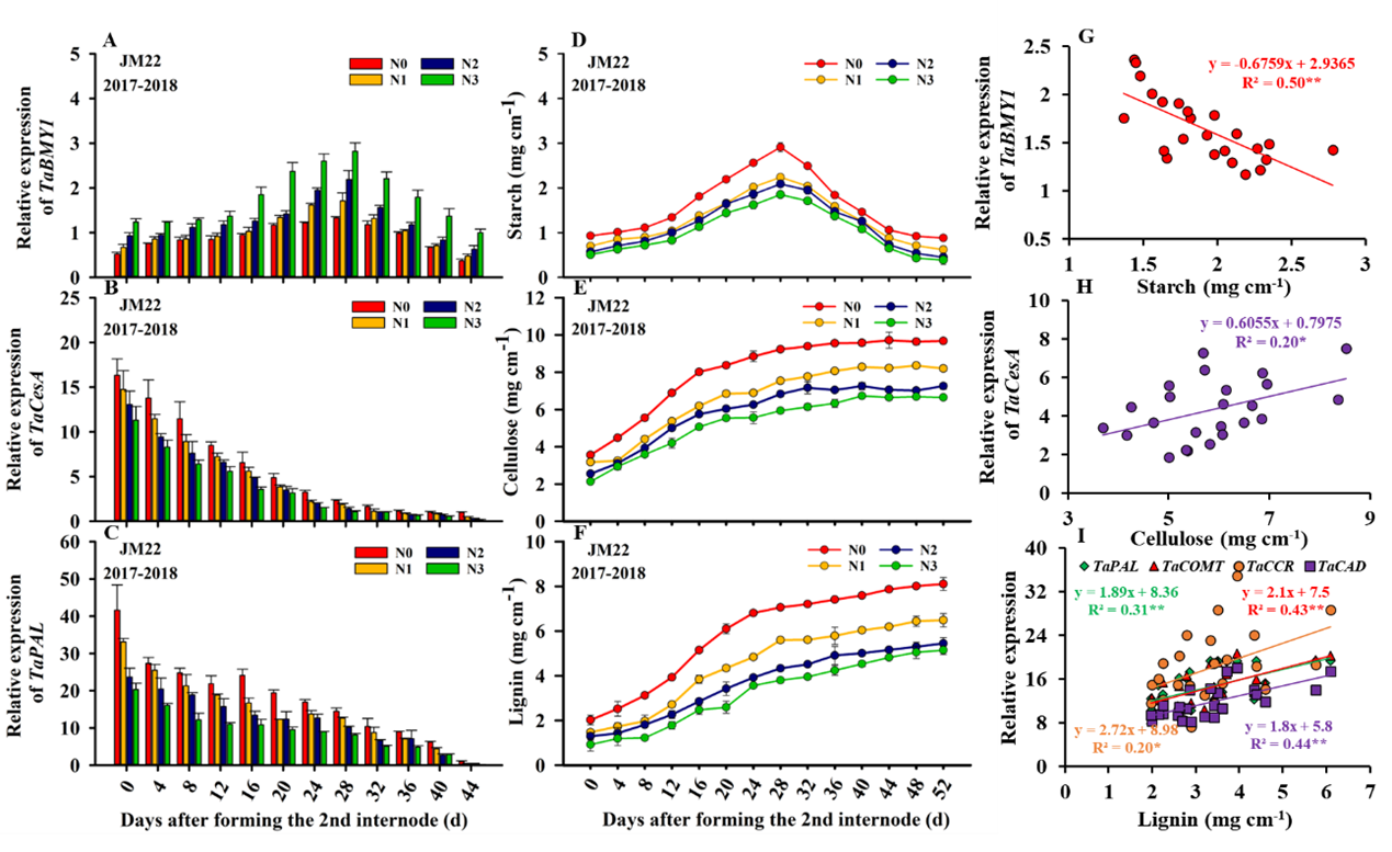 研究表明,每增加120kg hm-2的氮肥,叶片果糖、葡萄糖和蔗糖含量分别增加0.54mg g-1、3.80mg g-1和4.89mg g-1。虽然茎秆内可溶性糖含量减少,但淀粉降解酶基因TaBYM1表达量提高,导致淀粉被降解,茎秆用于碳水化合物合成的底物(葡萄糖)增加。然而,由于茎秆中木质素和纤维素合成的关键基因的表达减少,茎秆从同化物中合成纤维素和木质素的能力降低,导致茎秆的质量变差。最终,引发了倒伏,产量下降。