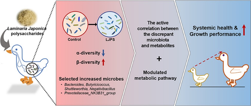 海藻多糖是一种具有多种生物学活性的生物大分子,但其用于养殖业对改善动物健康、提高生长性能的效果及机制仍不明确。该研究证实了海藻多糖能够提高肉鸭生产性能和系统健康,其作用机制在于海藻多糖通过靶向调控肠道微生物及其代谢组,从而上调了生长相关的代谢通路,实现了对动物生长的调控。研究也进一步验证了,大分子植物多糖通过“多糖-肠道微生物/代谢组-宿主表型”轴实现对宿主表型和生理健康影响的机制。这位今后利用植物多糖开展对肠道微生物的靶向调控而实现对动物生长性能、产品品质或疾病的调控和治疗提供了新的思路。