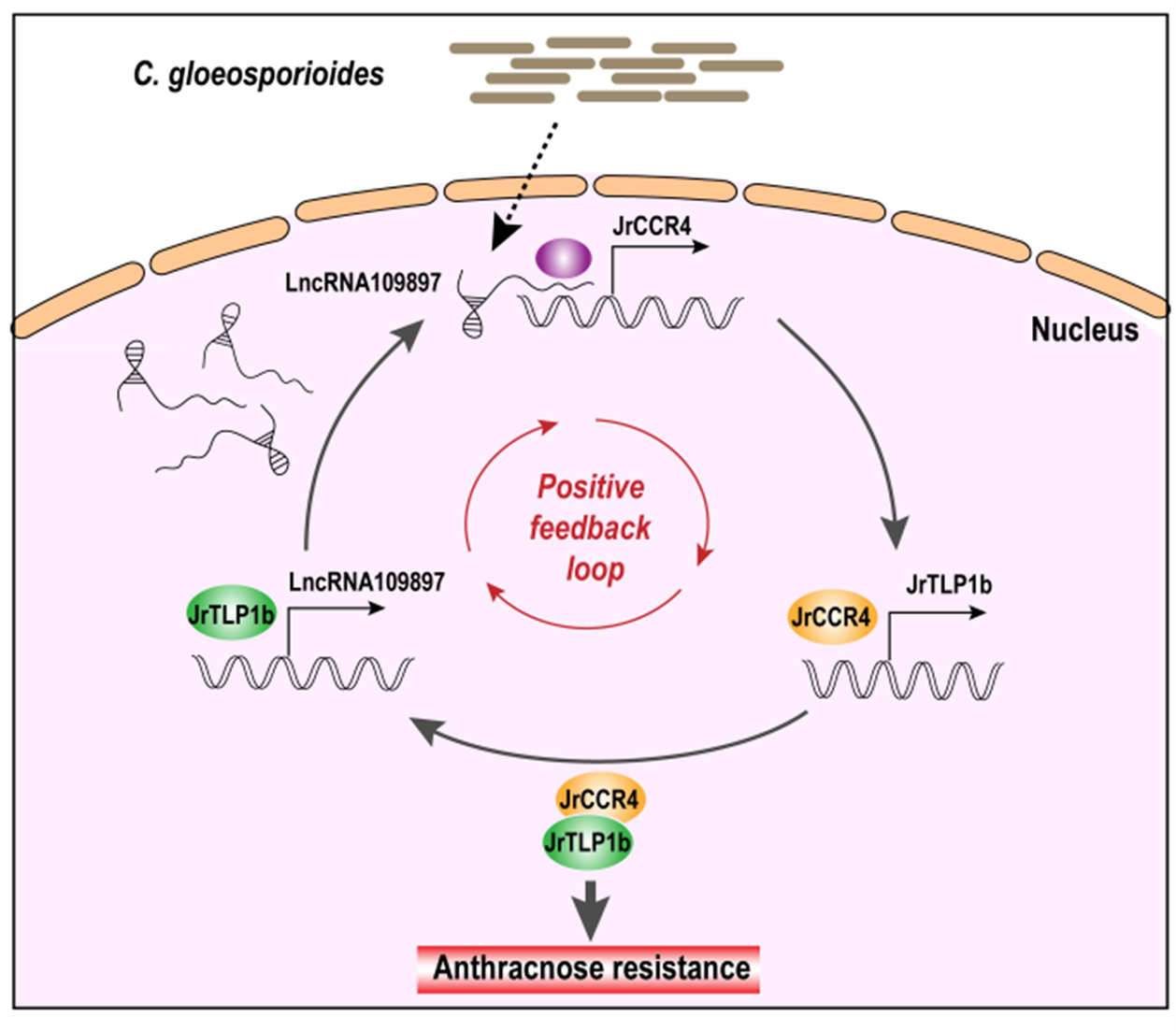 图1. 分子模块 LncRNA109897-JrCCR4-JrTLP1b 调控核桃对炭疽病抗性