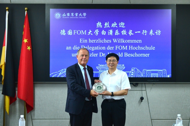 冷畅俭介绍了学校近期办学发展情况和中外合作项目推进情况,与白潇乐一行围绕不断巩固合作平台、创新合作理念、拓宽合作领域等内容进行深入交流。他说,山东农业大学高度重视国际合作交流工作,围绕现代农业,与全球高校、科研院所和企业开展国际产学研用深度合作,在平台建设、科研项目合作和人才培养方面取得了一系列成绩。FOM大学是一所集学术性、实践性于一体的商学院,先进的实践教育理念、丰富的课程安排和优质的就业机会使其在德国乃至欧洲都具有很高的声誉。冷畅俭表示,今年恰逢我们两校合作20周年,希望双方继续密切联系,共谋合作双赢,培养更多怀抱理想又脚踏实地、敢作敢为又善作善成的优秀学生,携手为世界高等教育事业发展做出新的贡献。