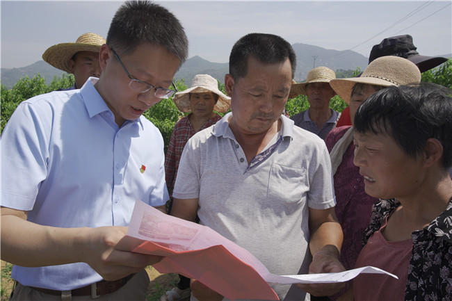 在桃园现场,刘振宇教授就桃穿孔病问题跟果农们沟通发病原因,介绍 “一清园、二套袋、三喷药、四壮树”的防治方案;原雪峰教授介绍主要病害的防治要点和后期管理原则;薛超彬教授介绍桃园农药使用方案;参加活动的青年教师回答果农关于桃园害虫的管理技术问题。听说农大专家到田间地头作技术指导,果农纷至沓来越聚越多,现场记录、拍照、录像,拿着专家给的明白纸,像收到了灵丹妙药,笑得合不拢嘴。