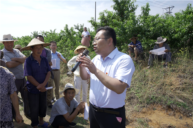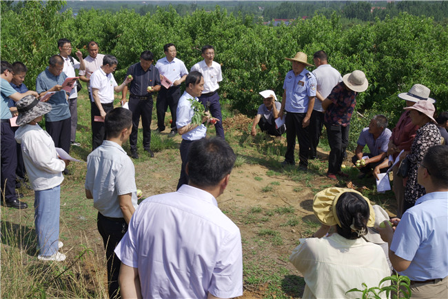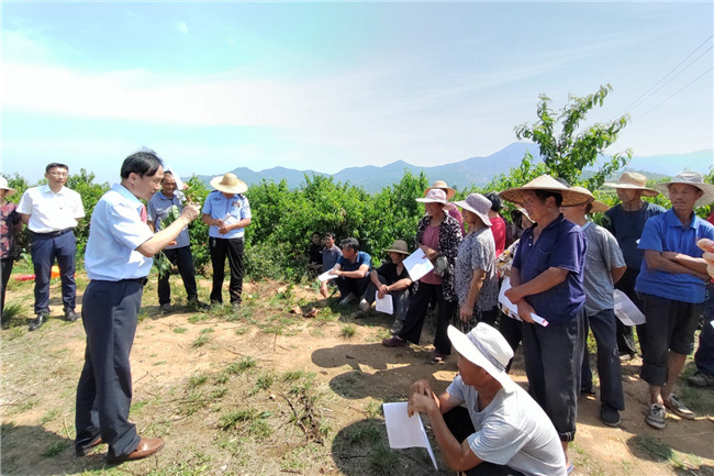 6月21日,骄阳似火。临沂市蒙阴县垛庄镇桃园里,山东农业大学植物保护学院组织相关专家,给当地果农上了一堂“紧急的”桃园病虫害管理现场技术指导课,手把手交给果农病虫害防治方法。