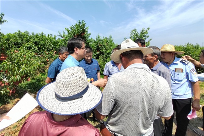 得知此事后,参与的植保专家越来越多。21日,植保学院党委书记安宁、院长原雪峰带队,再次赴垛庄果园镇现场调研。随行的专家,有擅长桃穿孔病防治的刘振宇教授、有提出桃园全程(不套袋)植保技术方案的薛超彬教授、有拿出用药防治害虫方案的刘永杰教授,还有专注林果病虫害防控的昆虫学系党支部书记闫毅副教授,陈珍珍、于成明、田叶韩等几位青年教师也加入了科技支农队伍。
