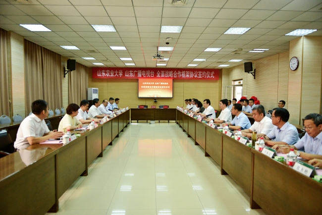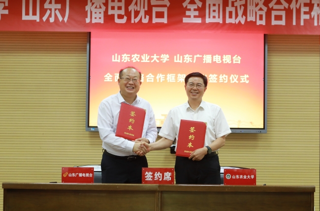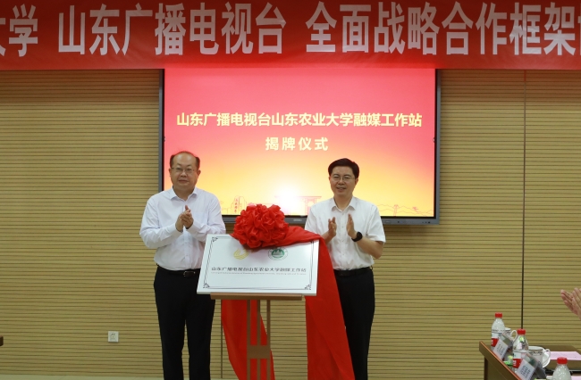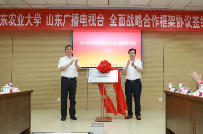 7月17日,山东农业大学与山东广播电视台全面战略合作协议签约仪式暨山东农业大学融媒体中心、山东广播电视台山东农业大学融媒工作站揭牌仪式在我校举行。山东农业大学党委书记徐剑波,山东广播电视台党委书记、台长吕芃出席活动并致辞,山东农业大学党委副书记、校长冷畅俭,山东广播电视台党委副书记张卫华参加活动,山东农业大学党委副书记张然主持活动。