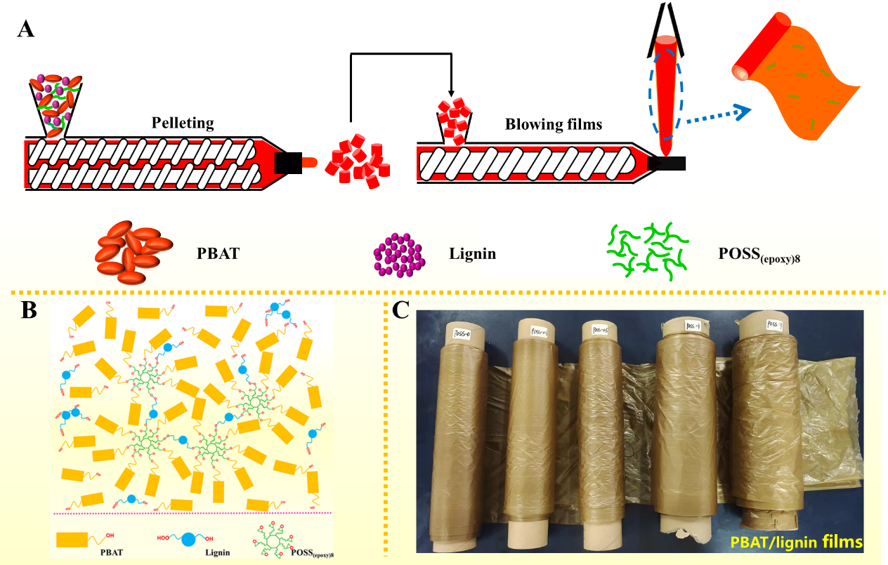 图1:(A)PBAT/木质素薄膜制备流程图,(B)PBAT、木质素和POSS(epoxy)8相互作用示意图,(C)PBAT/木质素薄实物图