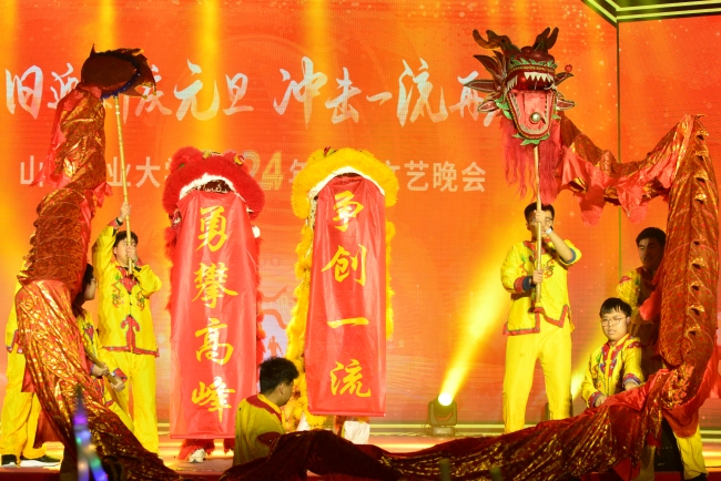 晚会以“辞旧迎新庆元旦 冲击一流再启程”为主题,由在校师生、离退休教职工、附校学生共同演绎。晚会在山东农业大学民乐团带来的《盛世欢歌》中拉开序幕,离退休教师的歌伴舞《亲吻祖国》、附校小朋友带来的舞蹈《甜甜的糖球会》与山农学子的《龙狮踏春》、《节日欢歌》营造出浓厚的节日氛围。