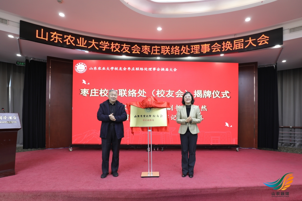 山农融媒1月27日讯 1月24日,山东农业大学校友会枣庄联络处理事会换届大会在枣庄举行。山东农业大学党委副书记张然、枣庄学院原纪委书记高庆喜出席会议并共同为山东农业大学校友会枣庄联络处揭牌。