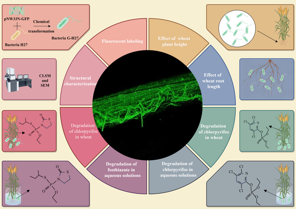 结果表明,G-H27具有很强的生物膜生产能力,并能在小麦根表面形成成熟稳定的生物膜。G-H27在植物根表面定殖以及成膜不仅降低小麦根系毒死蜱和噻唑膦的含量,降低小麦茎叶中噻唑膦的含量,还能促进小麦生长。综上,利用外源强化手段在作物根表面快速构建降解菌生物膜,增强降解菌的降解性能,阻控毒死蜱和噻唑膦在环境-作物体系迁移,达到良好、持续的控污效果,为微生物成膜治理污染环境提供了新见解。