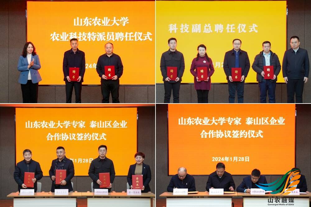 会上,学校与泰山区签订校地战略合作框架协议、泰山区有关企业与学校相关专家签订合作协议,并为2024年泰山区—山东农业大学农业科技特派员、创新创业导师和科技副总颁发聘书。
