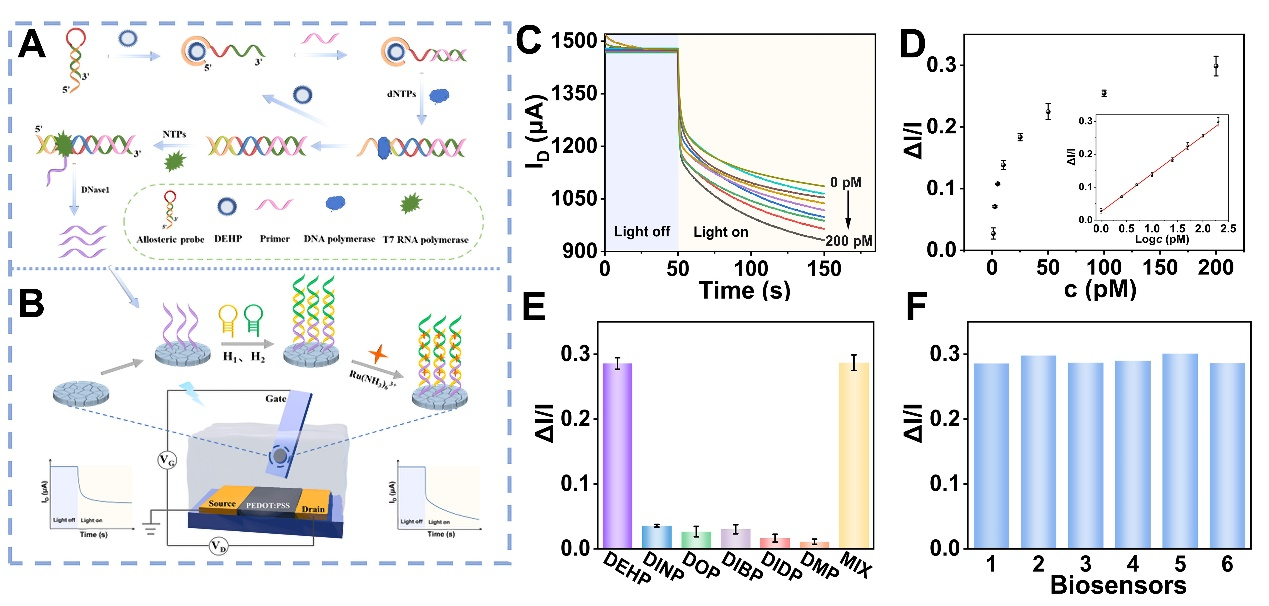 邻苯二甲酸二(2-乙基己基)酯(DEHP)是一种广泛使用的工业增塑剂,容易从塑料产品中渗出进入环境,通过饮食或呼吸进入人体内,对人类的健康产生不利影响。因此,迫切需要一种简便、高效、灵敏的DEHP检测方法。周云雷博士将有机电化学晶体管和光电分析化学相结合,构建了一种新型有机光电化学晶体管(OPECT)适体传感器。如图1所示,该方案采用发夹结构的DNA适配体作为DEHP的识别元件,以靶依赖性DNA杂交链式反应(HCR)为信号放大单元,Ru(NH3)63+为信号放大分子来实现信号的增强。该信号增强与适配体结合靶分子触发的酶催化生物链扩增具有相关性,使得DEHP浓度与传感器的沟道电流有良好的线性关系,从而实现对DEHP的检测。该工作中,张浩伟提出了将MXene/Bi2S3/CdIn2S4复合光活性材料调制的PEDOT:PSS型OPECT传感平台用于DEHP检测的策略。在优化的实验条件下,检测范围为1-200 pM,最低检测限为0.24 pM。所开发的传感器显示出高灵敏度和高选择性,并对其在实际水样中的应用进行了评价,取得令人满意的结果。因此,这项工作不仅为DEHP的检测提供了一个新的传感平台,而且为其他污染物检测领域开辟了一种新的技术。