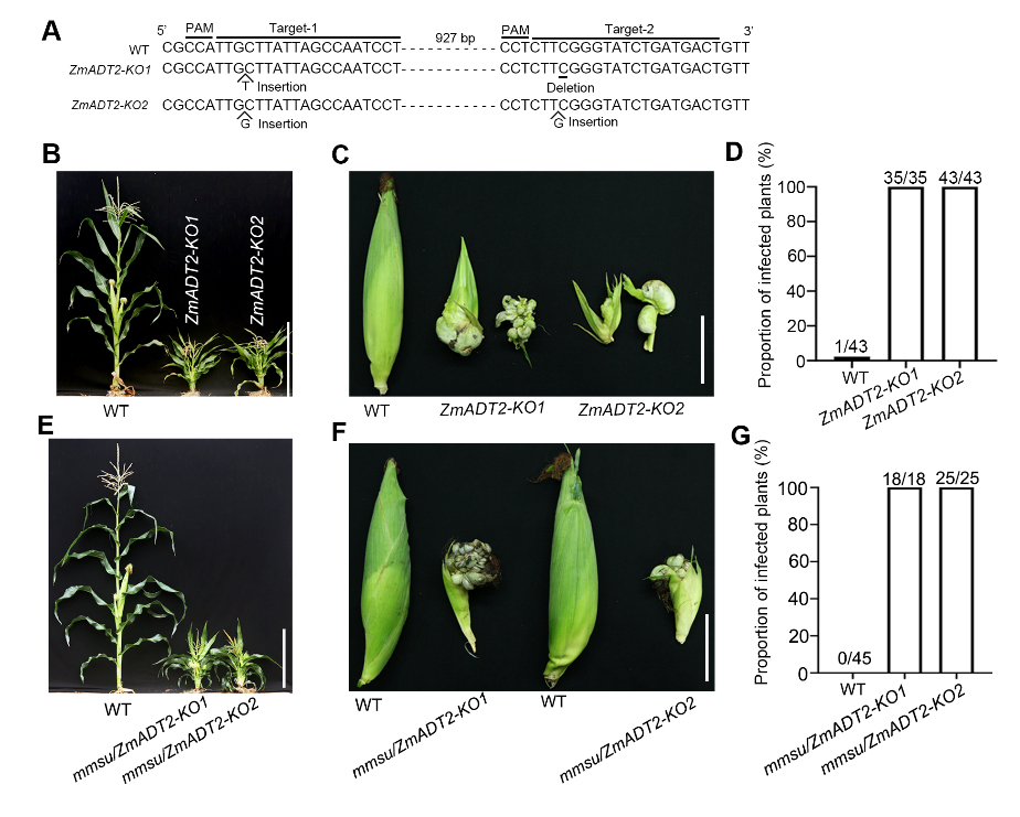 玉米瘤黑粉病是由生物营养型真菌(Ustilago maydis)引起的真菌病,广泛存在于我国各个玉米栽培区。玉米瘤黑粉病可以在玉米的各个地上器官发病,尤其是玉米的雌穗和雄穗,进而影响玉米的产量。近日,生命科学学院张宪省赵翔宇团队在Plant Physiology上发表题为“Maize requiresArogenate Dehydratase 2 for resistance toUstilago maydisand plant development”的研究论文,揭示了玉米ZmADT2基因在调控玉米植株发育及瘤黑粉病抗性方面发挥重要作用。