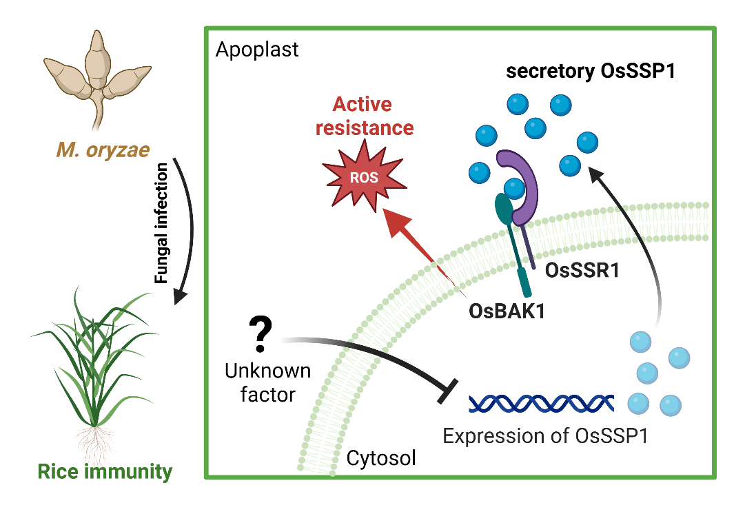 近日,Molecular Plant在线发表了植物保护学院丁新华教授团队题为“Recognition of the inducible, secretory small protein OsSSP1 by the membrane receptor OsSSR1 and coreceptor OsBAK1 confers rice resistance to the blast fungus”的研究论文。该研究揭示了一个水稻分泌小蛋白OsSSP1在稻瘟病菌侵染阶段从细胞内被分泌到质外体空间中,被植物自身膜受体OsSSR1及共受体OsBAK1所识别,激发植物免疫的分子机制。同时发现,植物的这种对自身分泌蛋白的自我识别过程产生的抗性具有很好的广谱性。该工作对丰富水稻广谱抗性资源、控制水稻病害,保证粮食安全具有重要意义。