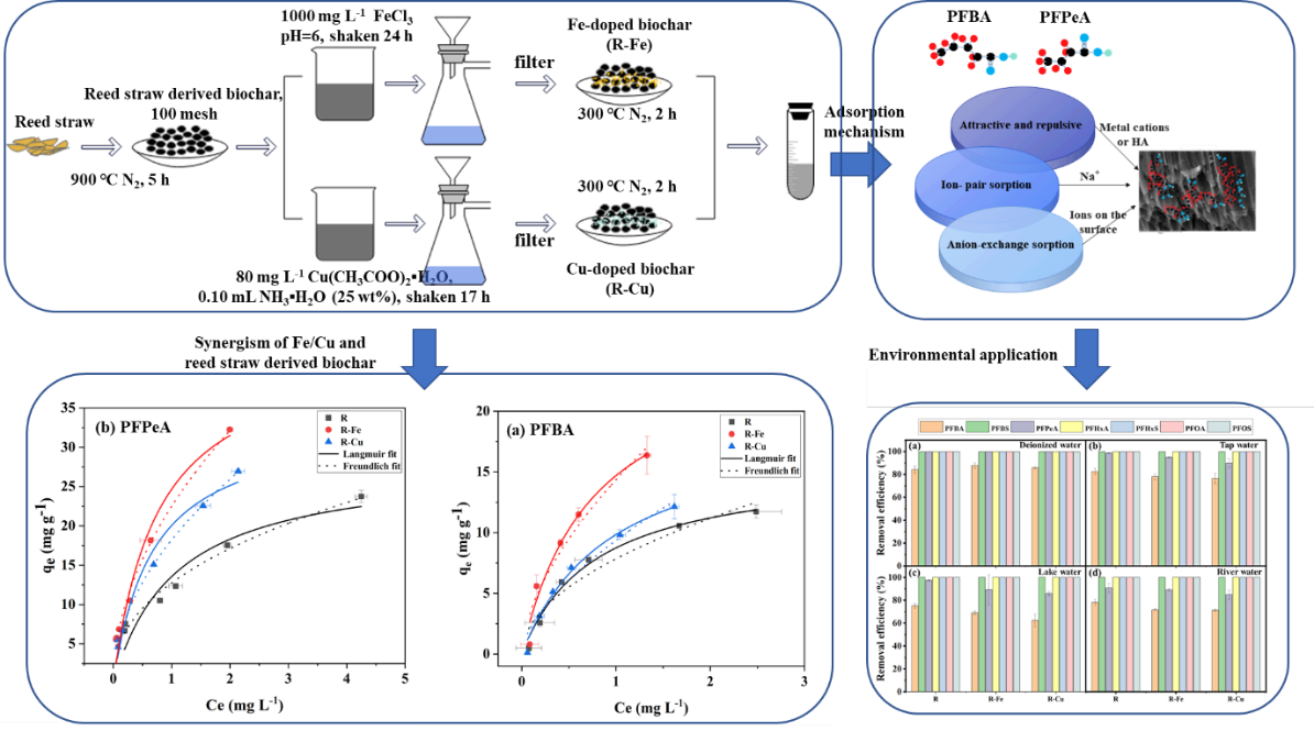 近年来,随着对长链全氟化合物(PFAS)的管控,毒性相对较低的短链全氟化合物(C4-C6)作为替代品产生的环境风险备受关注。与长链PFASs相比,短链PFASs分子更小,亲水性更强,更易在长距离内通过空气、水等介质进行传输,对环境产生更加持久、广泛的影响。目前为止,在饮用水、沉积物、污水污泥甚至极地地区的雪/冰中都被广泛检测到短链PFAS的存在,因此,迫切需要从环境中去除短链PFASs。生物炭作为一种具有优良成本效益的吸附剂,在水环境中长链PFAS去除方面表现出了较高潜力,但在短链PFAS吸附中存在很大弊端。本研究基于先前研究基础,利用铁氧化物和铜氧化物改性了芦苇秸秆生物炭,分别对短链PFAS全氟丁酸(PFBA)和全氟己酸(PFPeA)的吸附量显著提高了1.24和1.20倍,利用采用扫描电子显微镜、能谱分析、能谱分析、x射线光电子能谱和傅里叶红外光谱等方法对吸附机理进行了微观层面的探讨。研究了不同环境条件下(pH、腐植酸浓度和背景电解质离子强度变化)对短链PFASs吸附行为的影响。在实际应用中,本研究制备的芦苇秸秆生物炭和经Fe/Cu氧化物改性的生物炭在去除水溶液中PFBA和PFPeA以及各种天然水体介质中多种长链和短链PFASs吸附方面表现出优异的性能。