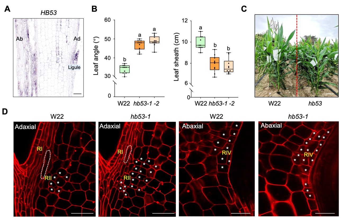 图3. 转录因子HB53是玉米株型建成和避荫反应的重要调控因子