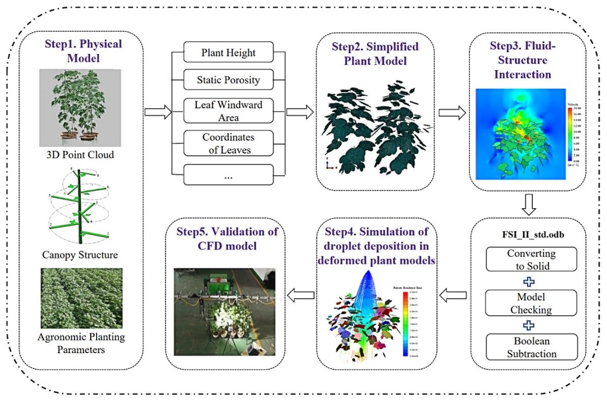 棉花是我国主要经济作物、纺织工业原料、重要战略物资,棉花整个生育期内涉及植保、化控、封顶、脱落叶剂喷施等施药的精量化、高效率和高防效作业问题。以棉花为例,本团队创新地提出了一种称为两阶段模拟的方法,其中一个阶段涉及辅助气流与植株多叶片的流-固相互作用,另一个阶段涉及在辅助气流和雾滴的气-液相互作用下变形植物冠层内雾滴沉积的离散粒子跟踪模拟。首次揭示了气流辅助施药柔性多叶片变形过程中冠层内雾滴的运动和沉积行为。