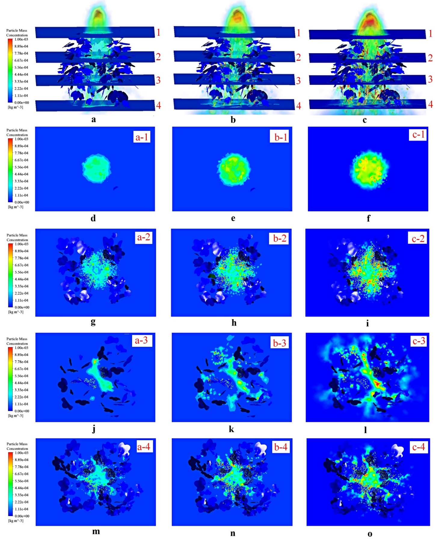 图2. 不同喷雾流量下整个冠层(a、b、c)、冠层顶部(d、e、f)、上层(g、h、i)、中层(j、k、l)、下层(m、n、o)液滴沉积浓度分布云图
