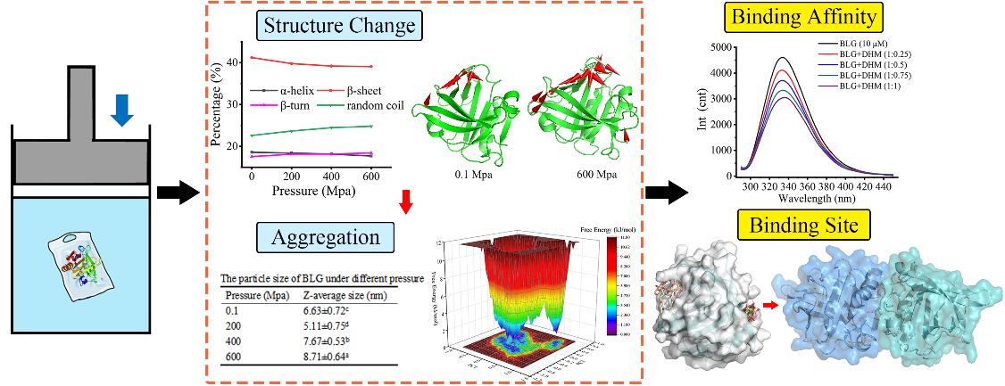 高压处理(HPP)是食品加工中常见的非热处理方式。受限于加工环境,常规的实验方法难以探究HPP对食源蛋白等大分子结构的影响。针对这一问题,该研究以牛奶中主要蛋白成分-β乳球蛋白(BLG)为研究目标,以分子动力学模拟为基础,通过模拟不同压力条件下BLG的结构和聚集位点变化,系统研究了HPP对BLG与不同结构多酚相互作用的影响。结果表明,压力的增加会增强BLG氨基酸(尤其是loop区域)的活动性,致使蛋白质有序结构减少,并且loop区域向疏水腔移动。不同结构多酚与BLG的结合亲和力随压力变化的改变不同。HPP导致的BLG结构和聚集位点变化会改变多酚在BLG上的结合位点,最终影响其亲和力。黄酮类成分和芪类在400-600 MPa时达到最大亲和力。HPP增强了BLG与多酚在44GLU和160CYS等处的相互作用,范德华力主导了结合自由能。相反,木脂素类的亲和力随着压力的增加而降低。这项研究表明分子模拟是分析HPP对食品组分影响的有效方法,相关结果为开发富含多酚的功能食品提供了实验基础和理论依据。