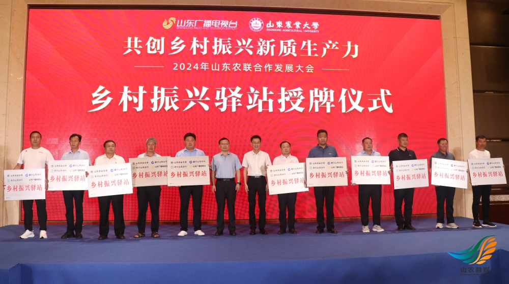 山农融媒7月22日讯 近日,由山东广播电视台农科频道主办的“共创乡村振兴新质生产力——山东农联2024年山东农联合作发展大会”在济南举行。学校党委常委、宣传部部长李广松出席活动并为乡村振兴驿站授牌,省农业农村厅农村合作经济指导处三级调研员陈洁,山东广播电视台生活农科管理运营中心总监谭鲁民等出席活动。