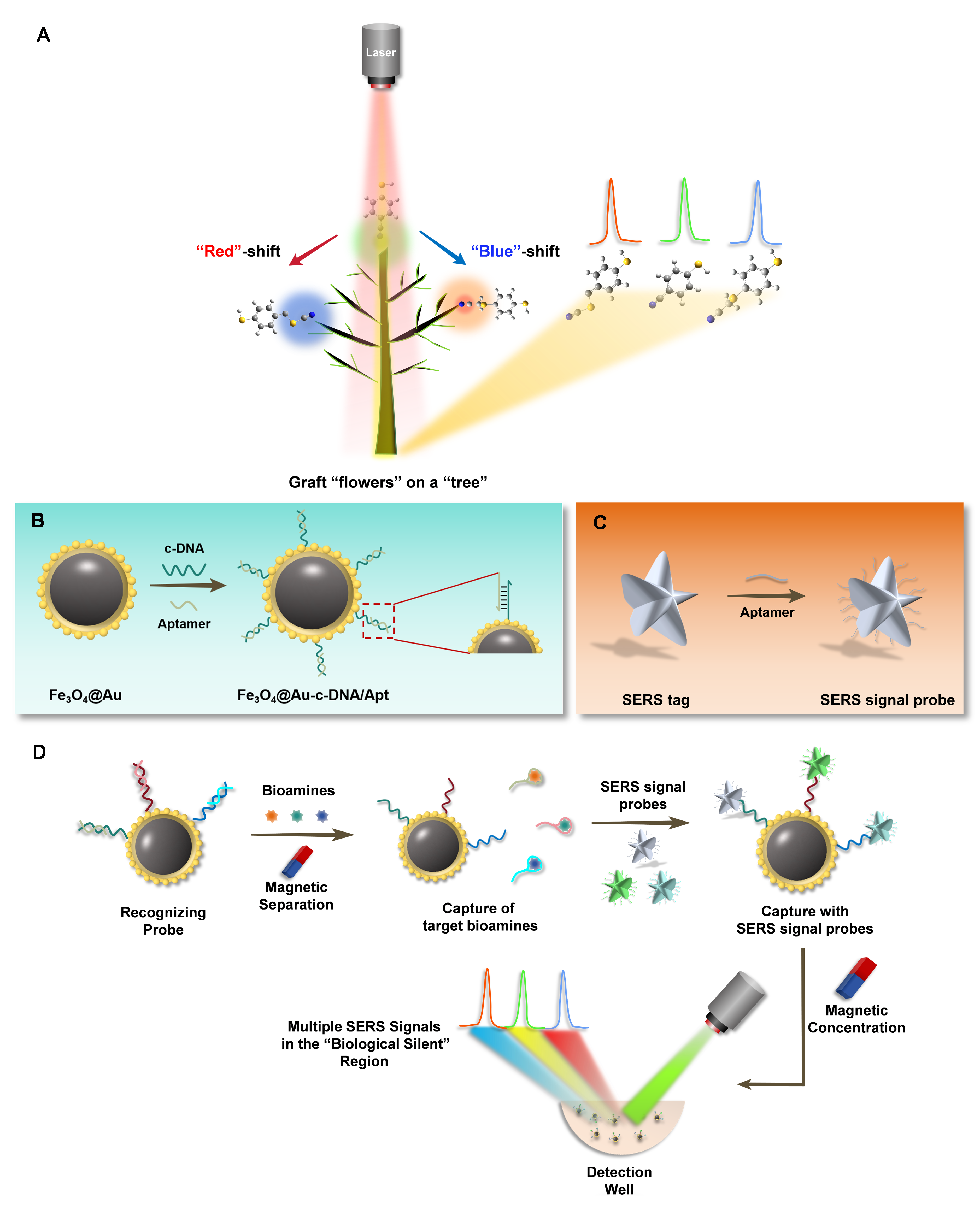 原理示意图:(A)含氰基拉曼报告分子的调控示意图;捕获探针(B))和SERS信号探针(C)的制备;(D)同时检测三种生物胺的SERS编码传感平台的构建。
