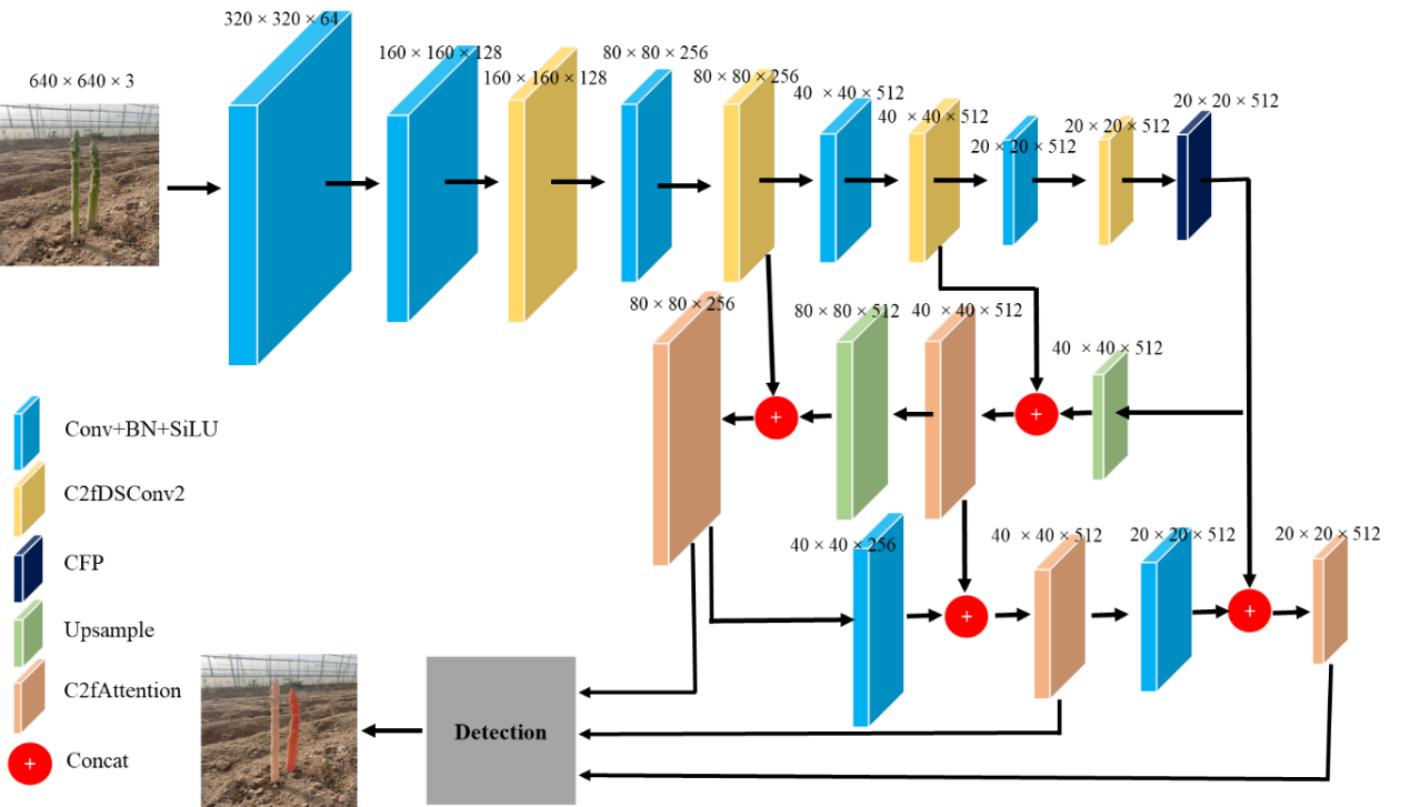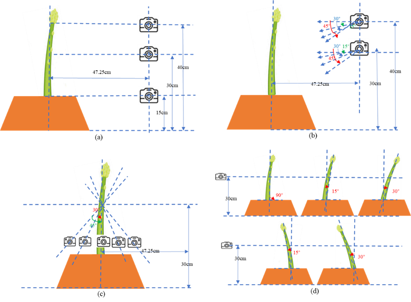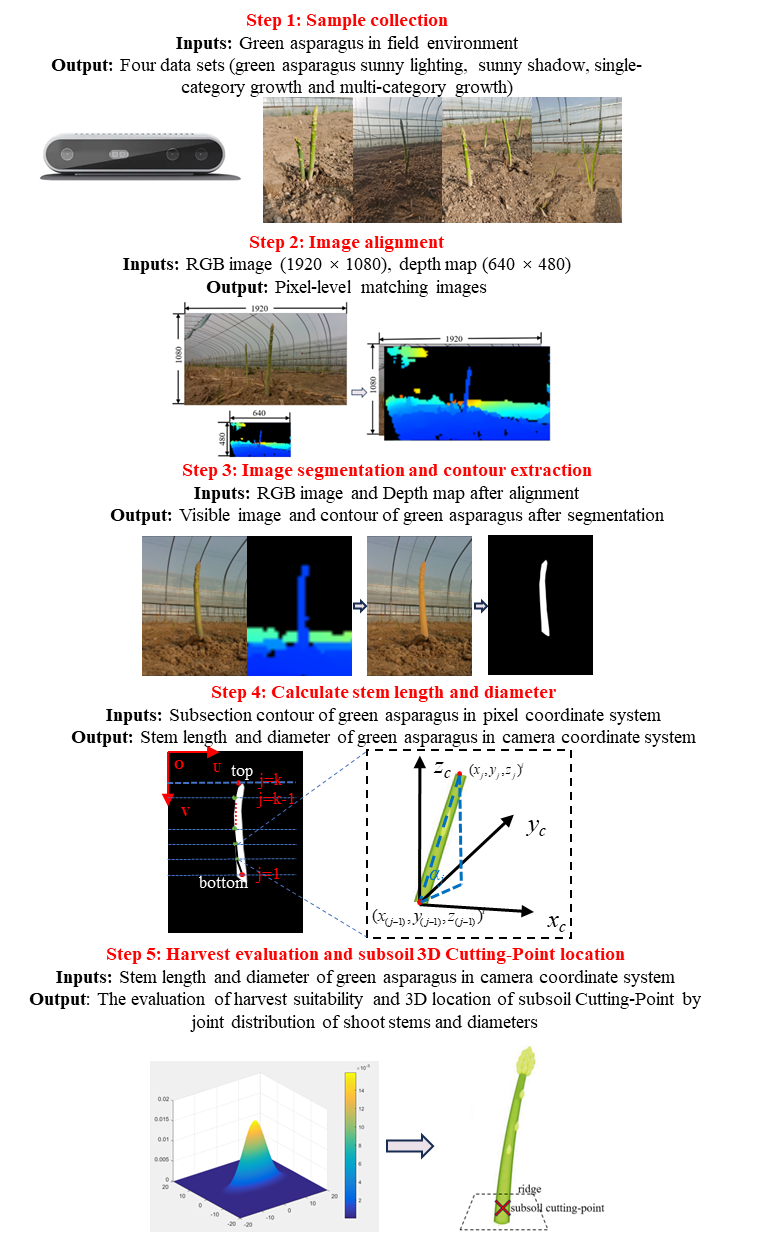 针对以上技术难题,山东农业大学苑进教授团队以大田种植的绿芦笋为研究对象,首创了S2CPL绿芦笋选择性采收过程中采收适宜性评价和土下切割点精确定位的关键方法。该方法利用RGB-D传感器获取绿芦笋的图像和空间深度信息,对YOLOv8的实例分割算法进行了研究和改进提高分割精度,同时提出了一种利用图像掩模融合深度信息计算绿芦笋长度和直径的三维形态提取方法,最终实现了机器人选择性采收的收获评价和图下三维切割点定位。该项研究还建立了一种为机械化采收末端执行器提供目标点信息的相机位姿优化方法。该技术有望为提高绿芦笋选择性采收中的视觉定位系统提供重要核心技术,实现成熟绿芦笋自动化、智能化采收,促进绿芦笋产业的发展。
