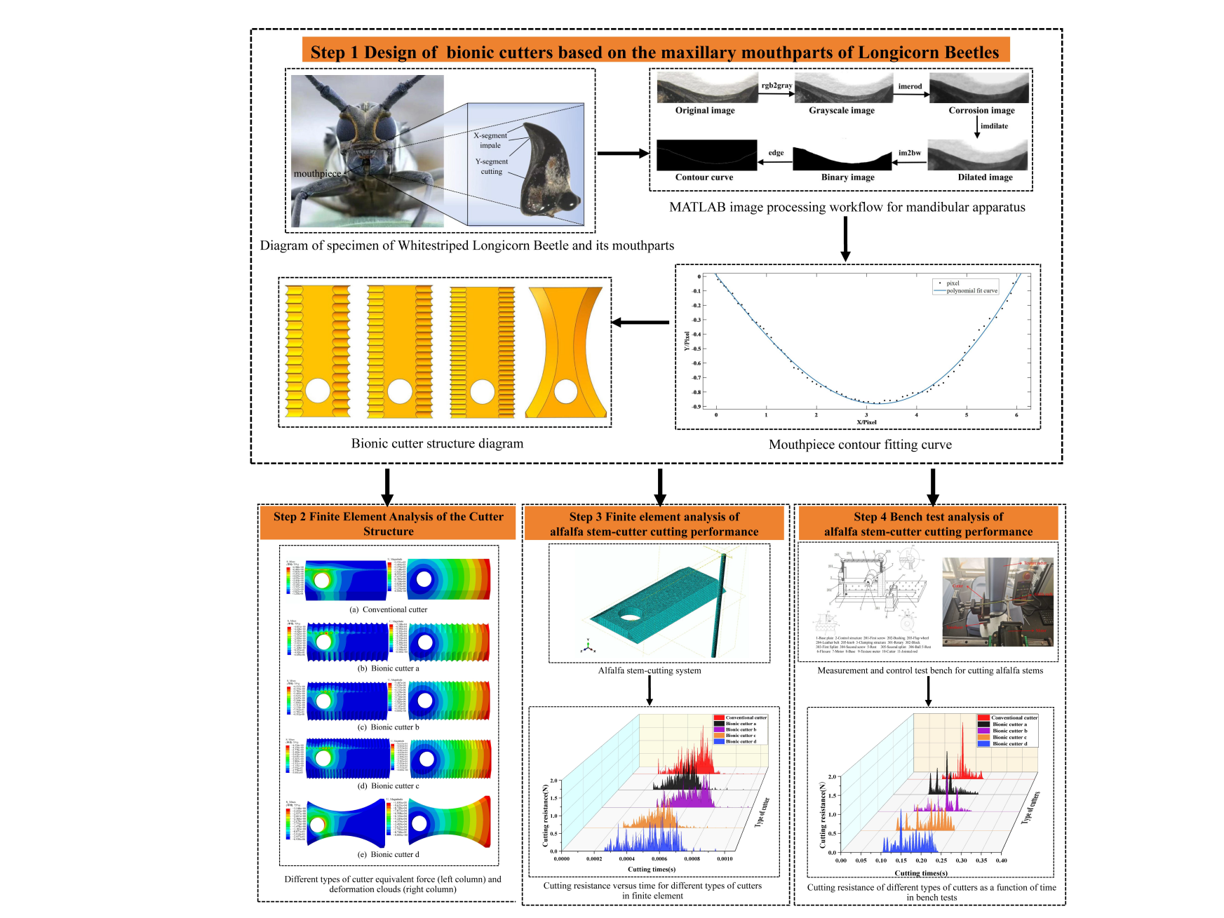 基于上述问题,宋月鹏教授团队采用仿生学原理,通过研究天牛下颚口器的结构与功能,设计了四种适用于苜蓿茎秆的切割刃具。研究团队利用有限元仿真技术及自制的茎秆切割力测控试验台,对仿生割刀进行结构特点与切割性能试验。结果显示,与传统的切割工具相比,相同作业条件下,四种仿生割刀的最大变形量降低了31.4%~64.1%;对苜蓿茎秆的最大切割阻力降低了28.6%~52.4%,茎秆切口损伤大大降低;台架正交试验表明,割刀种类、滑切角对茎秆的最大切割阻力有极显著影响(P<0.01),并获得了较优参数组合。