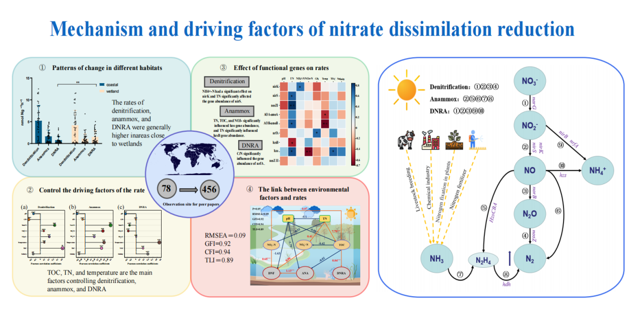 近日,生命科学学院高峥团队在环境学领域期刊Science of The Total Environment发表题为“Meta-analysis: global patterns and drivers of denitrification, anammox and DNRA rates in wetland marine ecosystems”的研究论文。文章对全球湿地海洋生态系统中反硝化速率、厌氧氨氧化速率和DNRA速率进行了系统研究,以揭示全球范围内三种典型氮转化速率的主要分布格局及影响控制因素。