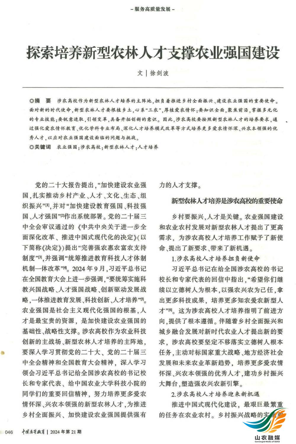 山农融媒11月29日讯 近日,2024年第21期《中国高等教育》刊发学校党委书记徐剑波署名文章《探索培养新型农林人才支撑农业强国建设》。文章深入分析农业强国建设和推进乡村全面振兴背景下涉农高校人才培养的新使命、新要求,提出新型农林人才要根植乡土,心系“三农”,厚植爱农情怀;要知识全面,聚焦前沿,掌握多元化的专业技能;要锐意进取,引领变革,具备开拓创新的意识。文章指出,涉农高校要按照新型农林人才的培养要求,通过强化爱农情怀教育、优化学科专业布局、深化人才培养模式改革等方式培养更多爱农情怀深、兴农本领强的优秀人才,以应对农业强国建设面临的问题与挑战。