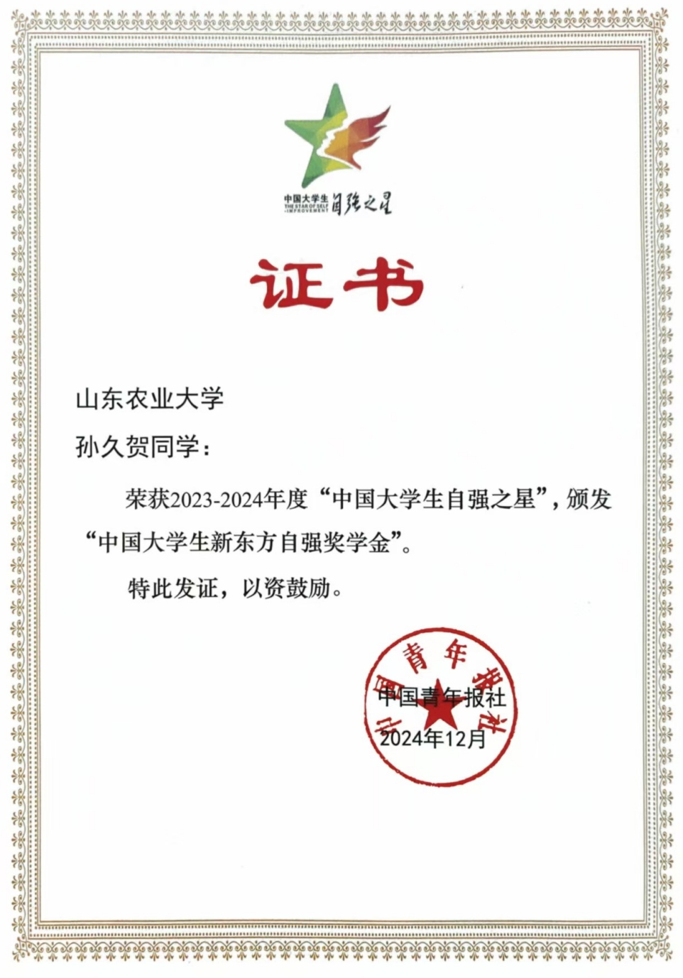 山农融媒1月15日讯 近日,2023—2024年度“中国大学生自强之星”评选活动结果揭晓,我校生命科学学院2020级本科生孙久贺荣获“中国大学生自强之星”荣誉称号和奖学金。