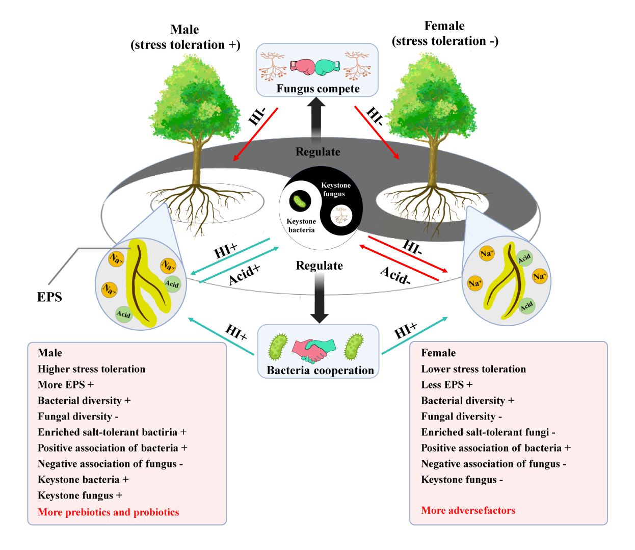 如何提高植物环境适应力和生产力是植物领域的百年议题。雌雄异株植物往往在适应力和生产力方面表现出显著的雌雄二态性,但雌雄异株植物的胁迫耐受性如何受根际微生物影响尚不清楚。本研究在前期开展杨树根际微生物随雌雄性别差异和宿主遗传效应研究基础上,进一步以杨树雌雄株为实验材料,通过代谢组和高通量测序分析,并基于新的生物信息学算法量化雌雄异株杨树根际微生物网络差异,探讨细菌真菌等微生物关联与杨树雌雄个体耐受盐胁迫能力的关系。研究结果表明,杨树雄株比雌株具有更高的适应性和耐受性,这与它们招募的特定微生物密切相关。细菌群落的多样性有利于宿主承受逆境胁迫,而真菌群落的多样性则不利于宿主。雄株根际中的微生物胞外多糖(EPS)含量高于雌株。雄株富含更多的耐盐细菌,而雌株富含更多的耐盐真菌。该研究深入揭示了盐胁迫下杨树雌雄株通过分泌柠檬酸,富集关键微生物,并通过微生物相互作用,塑造整个微生物群落,从而减轻逆境胁迫的机理,进一步阐明了微生物群落间的相互作用与植物-微生物相互作用之间的反馈。这为深入揭示植物适应性与植物根际微生物群落之间的关系提供了更多证据。