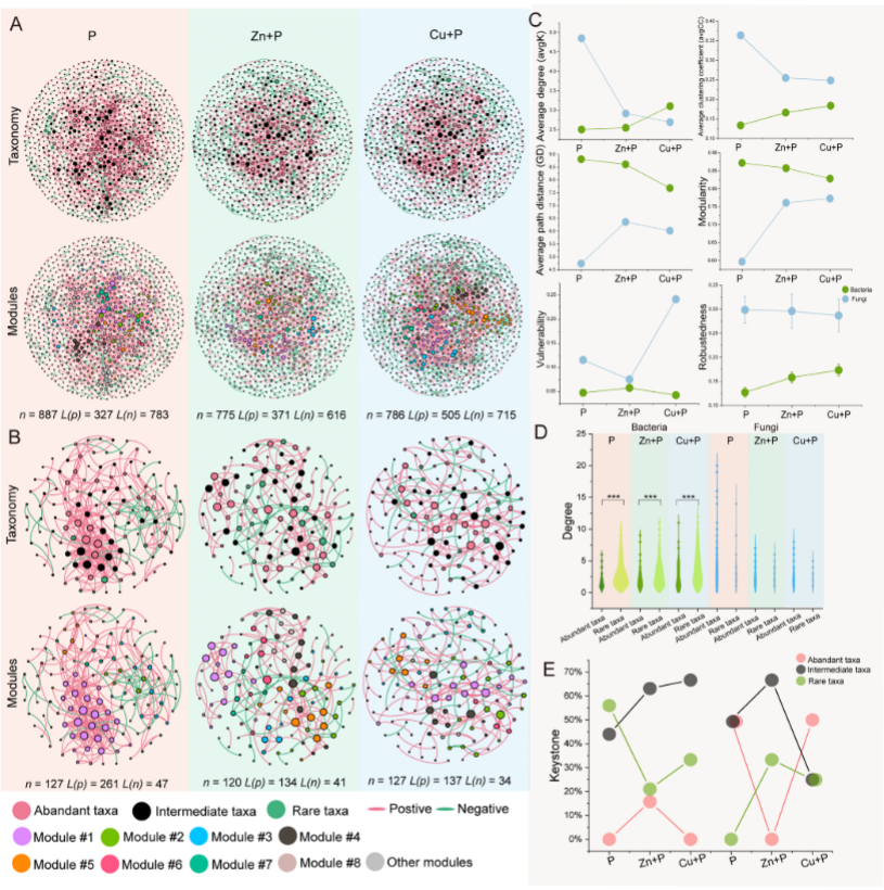 近日,生命科学学院高峥教授和周波教授团队在期刊《Ecotoxicology and Environmental Safety》发表了题为“Exposure to thiazole pesticides disrupts pathogens and undermines keystone status of rare taxa within bacterial ecological networks”的研究论文。文章系统探究了土壤微生物稀有类群对噻唑类农药的响应模式,结果显示农药暴露削弱了稀有类群在微生物分子生态网络中关键物种(keystone)节点的占比,对农业生态系统的稳定性造成潜在风险。