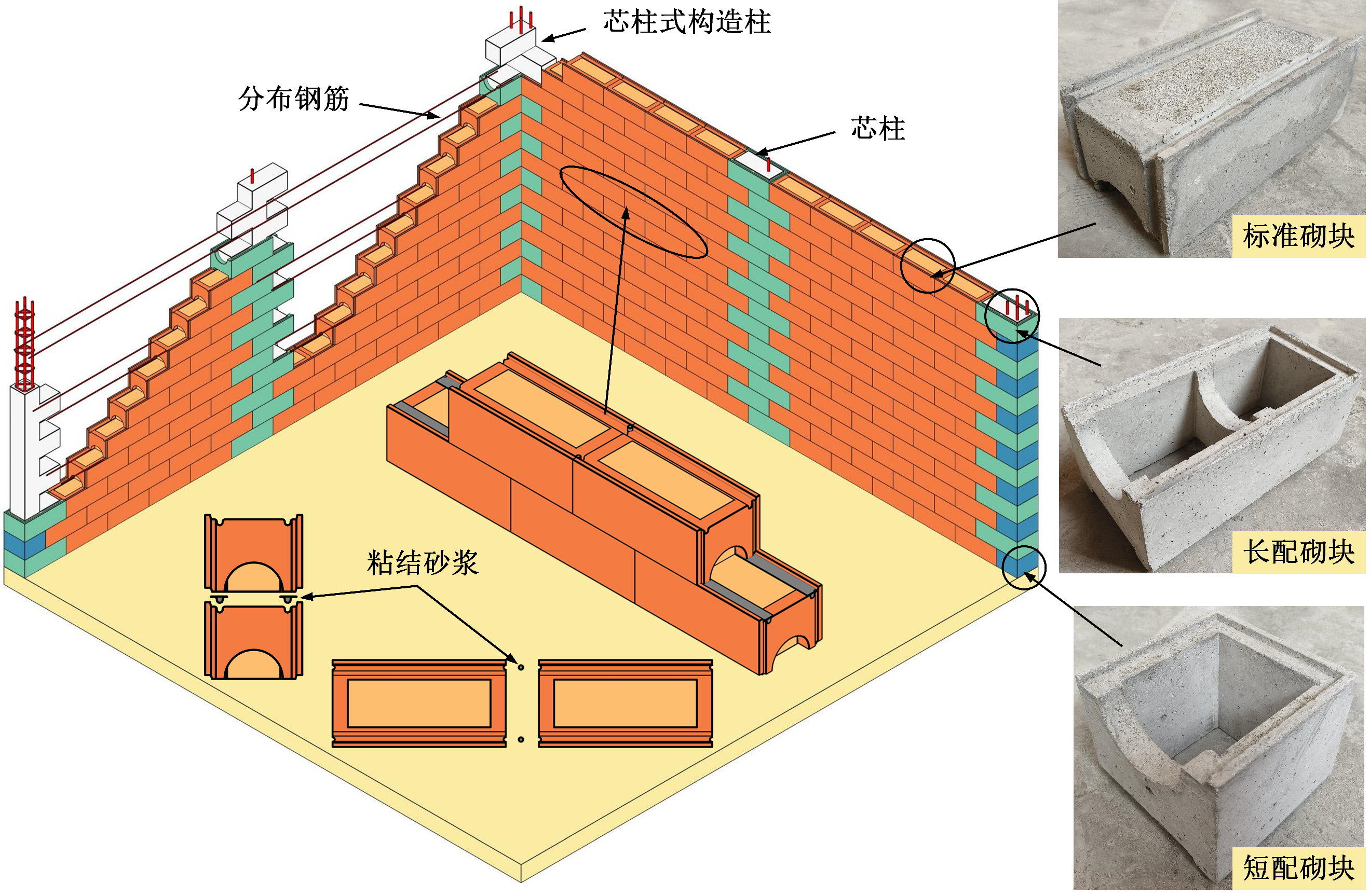 配筋砌块墙体由于具有节省模板、无需大型施工设备等优点,广泛用于城乡建筑工程领域,但随着现代工业化和城市化的发展,噪声污染逐渐影响着人们的生活和健康,为了满足人们对高品质建筑功能舒适性的要求,营造良好的室内声场环境尤为重要。为此,课题组提出了一种内置发泡混凝土的新型复合混凝土砌块承重墙体系(图1),具有重量轻、施工简便、隔音性能好等优点,配套使用薄层砌筑工艺,能够有效提高施工效率,且前期研究表明该新型砌块墙体具有良好的抗震性能和震后可修复性。