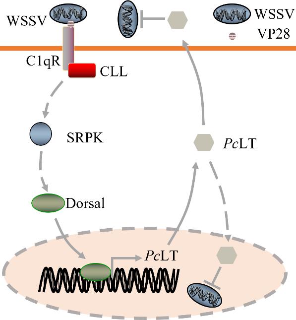机体对病原微生物的识别在宿主抵御病原体感染中起着重要作用。在脊椎动物中,补体系统在免疫防御中都起着重要的作用。C1q是补体系统关键起始分子,负责识别并结合抗原,gC1qR是C1q的受体。然而,节肢动物被认为不具备补体系统,只有gC1qR被报道。兰江风团队发现,一种包含C1q球状头部基序的C型凝集素(CLL)在胞内与gC1qR相互作用参与抗病毒免疫:当白斑综合征病毒(WSSV)感染时,gC1qR从胞质转移至细胞膜识别WSSV最主要囊膜蛋白VP28,募集胞内CLL,激活丝氨酸/精氨酸蛋白激酶(SRPK),SRPK促进转录因子Dorsal进入细胞核调控抗病毒蛋白PcLT的表达,抑制WSSV的组装和再感染。该研究揭示了宿主识别病原体的新机制,有助于阐明补体系统的进化过程和凝集素在节肢动物抗病免疫中的不同作用。