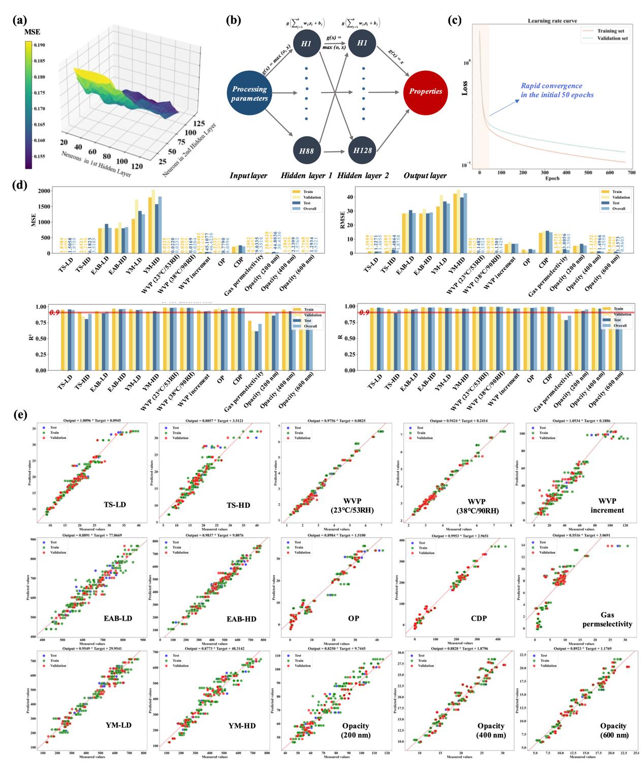 图5 人工神经网络模型的建模、拓扑结构、训练信息及预测能力