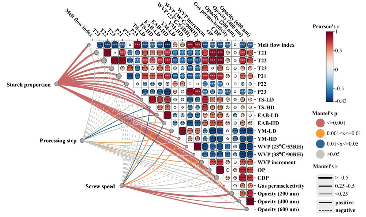 为此,本研究构建了一个仅包含淀粉、甘油与PBAT的简化体系,以系统研究淀粉/PBAT复合材料在挤出成膜过程中的结构演变。在此基础上,通过挤出吹塑工艺共制备了60种不同配方的淀粉/PBAT薄膜,建立了包含18个变量的数据库,涵盖淀粉比例、加工步骤、螺杆转速、机械及阻隔性能等指标。结果表明,成膜过程中淀粉发生了键断裂、双螺旋结构崩解与分子量降低;而在吹膜阶段,淀粉与PBAT相内的分子重排及结晶状态变化导致体系出现相分离现象。通过三因素方差分析、两步聚类分析以及Pearson与Mantel相关性分析,揭示了成膜参数与薄膜理化性能之间的内在联系。在此基础上,构建了基于加工参数的人工神经网络模型,实现了对薄膜机械与阻隔性能的精准预测,模型表现出较高的拟合度(R> 0.9)与良好的泛化能力。本研究有助于深入理解加工条件对淀粉/PBAT薄膜结构与性能的影响机制,并为其工业化制备与性能优化提供了重要的理论与数据支撑。