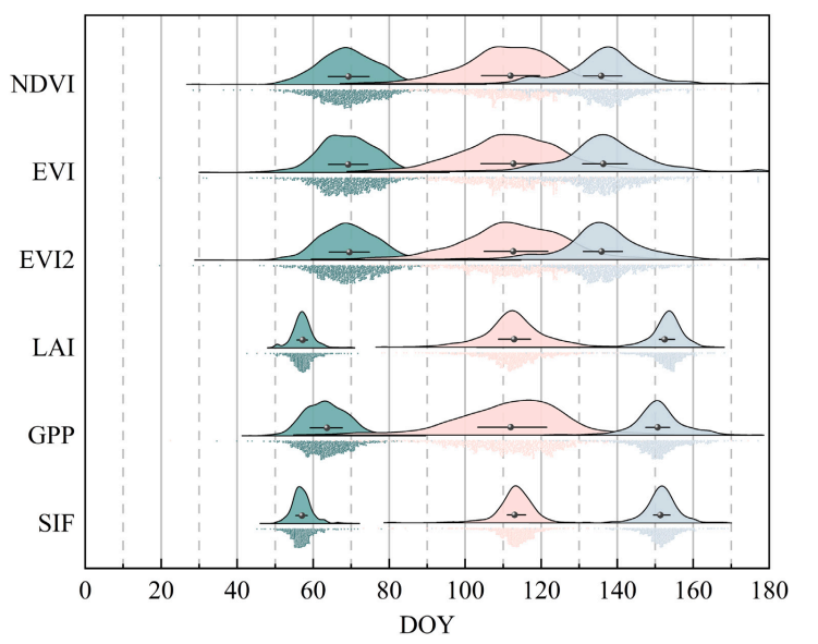 研究基于2000~2023年数据,对比了冬小麦主产区华北平原地区太阳诱导叶绿素荧光(SIF)与常用遥感指标归一化植被指数(NDVI)、增强植被指数(EVI)、两波段增强植被指数(EVI2)、叶面积指数(LAI)及总初级生产力(GPP)等提取的冬小麦物候信息。结果表明,由SIF提取的物候指标在捕捉物候变化时展现出更优的稳定性,物候阶段划分清晰且无重叠现象。SIF提取结果表明冬小麦返青期(GUD)主要集中在每年第52~62天,52.4%的区域呈提前趋势;抽穗期(HE)集中在第115~125天,58.7%的区域呈延迟趋势;成熟期(MA)集中在第152~160天,58.6%的区域呈延迟趋势。通过分析置信椭圆,最普遍的物候变化模式(占比23.67%)表现为三个生长阶段均提前,空间分布呈“东南—西北”走向。温度是物候期提前的主要驱动因素,而降水的影响虽整体有限,但随生长季推进,其影响程度逐渐增强。这些研究结果凸显了作物物候研究中指标选择的重要性,并为气候变化背景下的适应性水资源管理策略提供了指导。